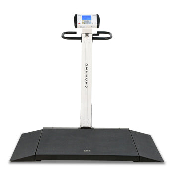 DETECTO’s 6550 portable wheelchair scales offer time-saving and patient comfort benefits. The 6550 features 1,000 lb / 450 kg capacity, optional Wi-Fi for EMR/EHR, vertical fold-up storage, two-way built-in ramps for accessibility from both sides, large 32 in x 36 in / 81 cm x 91 cm platform, clinical-grade accuracy to 0.2 lb / 0.1 kg, battery or AC power, and up to 99 tares (optional) to store wheelchair weights for efficient patient weighing. The ramps rest on the floor for easier patient access. With only one hand you can quickly slide the release lever and fold down the 6550’s column down for easy transport or vertical storage. The platform is only 2.2 inches/56 mm high for easy patient accessibility and comfort while weighing either standing or in a wheelchair. The 6550 is NTEP and OIML certified for medical dosage accuracy. The AC adapter is included. Enjoy the time-saving benefits of this scale, by using the convenient pushbutton or keypad tare to remove the wheelchair weight. OIML EC Class III model available.