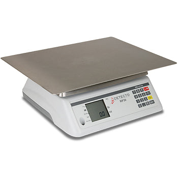 Detecto’s RP30 digital ingredient scale features 30 lb x 0.1 oz / 15 kg x 5 g capacity, a six digit, seven segment, 0.5 inch (13 mm) high backlit LCD display, weight accumulator memory to store the weighs of total ingredients being used, and a built in rechargeable battery with Auto-Off/Sleep Mode. A robust 360° rotating stainless steel platform tray ensures even distribution of ingredients, available as a round 13 inch (330 mm) or rectangular 17 x 13 inch (432 x 330 mm) variation.
