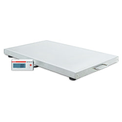 DETECTO’s VET550 is a stainless steel portable floor scale for weighing medium to large size animals and features a 550 lb / 250 kg capacity with .2 lb / .1 kg divisions. The large stainless steel 36 in x 22 in W / 90 cm x 56 cm platform with remote indicator may be used for mobile or stationary use in veterinary practices, animal health facilities, and zoos. The scale can be powered by the included AC power adapter or 4 AA batteries (not included). The programmable Auto-Shutoff turns off the scale when not in use to conserve batteries (adjustable up to 5 minutes). The stainless steel platform provides durability and easy wipe-down cleaning for animal weighing. The VET550’s HOLD key allows the animal’s weight to be retained after leaving the platform. Built-in wheels and an integral guide handle allow for easy transportation of the scale to a new location. A wall-mount display bracket and mounting hardware are included. The 7.0 ft (2.1 m) cable from the scale base to the display allows for the placement of the weight display wherever it is easiest to operate the keypad and read the weight.