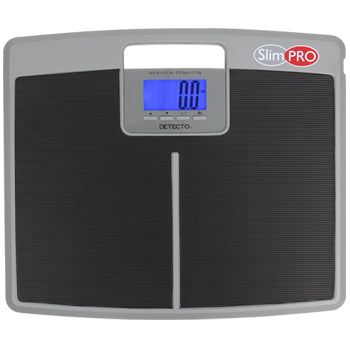 DETECTO’s SlimPRO talking healthcare scales are ideal for the elderly, obese, blind, and telemedicine use. They feature 600 lb/272 kg capacity, Mother/Baby weighing mode, ribbed rubber mat for traction, backlit blue LCD, and an integral carrying handle. The SlimPRO’s spacious platform size is 17 in W x 14.5 in D x 1.4 in H / 43 cm W x 37 \cm D x 3 cm H. The scale is easy to use for the vision impaired and provides a clear, pleasant voice announcement of the weight in your choice of two languages: English or Spanish. The voice function can also be turned off. The SlimPRO is a high-capacity, low-profile digital scale for clinical or personal weighing use. The spacious, extra-wide weighing platform easily accommodates patients up to 600 lb/272 kg. The stylish gray color blends into any environment. The scale automatically turns on when a patient steps on the scale and turns off when they step off.