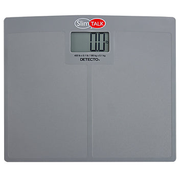 DETECTO’s SlimTALK talking bathroom scales are ideal for the elderly, obese, blind, and telemedicine use. The scale is easy to use for the vision impaired and provides a clear, pleasant voice announcement of the weight in two languages: English or Spanish (switch selectable). The extra-wide platform accommodates patients of all sizes. The very low-profile platform is only 1.4 in/36 mm high for easy access. The bilingual SlimTALK scale features 400 lb x 0.1 lb / 180 kg x 0.1 kg capacity, 3 AAA batteries included, large 1.5 in/38 mm high LCD digits for clear readouts, and 5 carpet feet included. The step-on/off function allows for weighing without stooping to switch on the scales and conserves battery life. The SlimTALK has a durable plastic platform with textured surface for weighing traction and user safety.